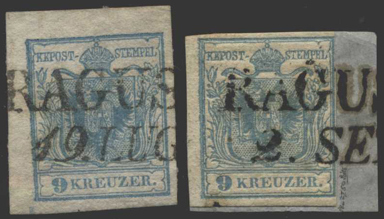 Österreich, 1850, Dalmatien, RAGUSA, jeweils sitzender Stempel auf zweimal 5 H I, lose Marke mit kleinem Balkenansatz links unten und Magistris P 70 mit Index 11,5, sehr gute Erhaltung!