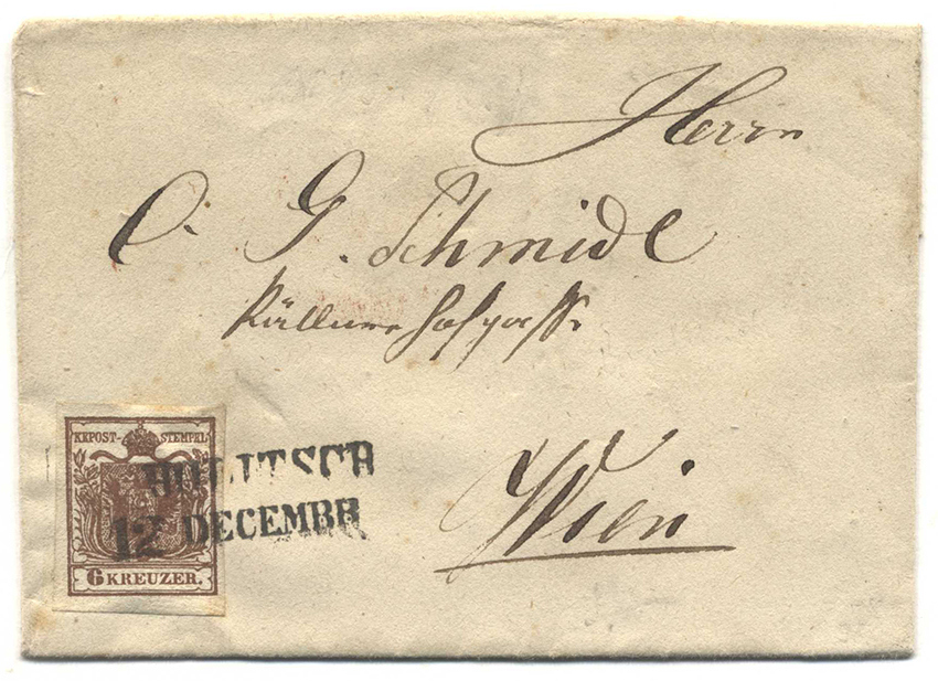 Österreich, 1850, Ungarische Gebiete Slowakei, HOLITSCH, 20 p, kompletter klarer Abschlag auf besonders farbintensiver 4 H I, auf kleinformatigem Faltbrief nach WIEN, erlesenes P!
