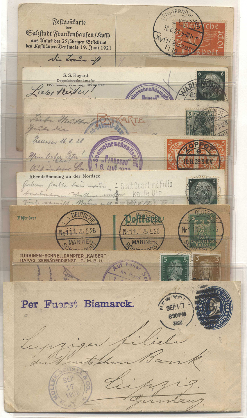 Katalognummer: 1382 Deutsches Reich, 1907/39, 11 Karten/Belege mit Schiffspostbezug bzw. Bordstempel, zusätzlich Karte vom Kyfthäuser Flug und US - Ganzsachenumschlag von NEW YORK nach LEIPZIG mit violettem Einzeiler "Per Fuerst Bismark", s... mehr lesen