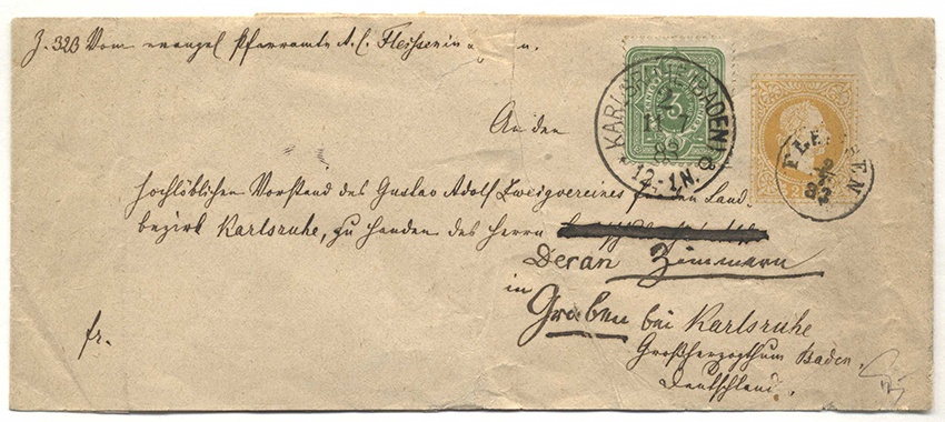 Katalognummer: 472 Österreich, 1883, FLEISSEN (B) - KARLSRUHE, rückseitig geöffnetes Streifband mit 2Kr - Wertstempel der Ausgabe, adressiert und gelaufen nach KARLSRUHE, heri wurde der Postweg unterbrochen, das wirkungsvolle Stück neu fra... mehr lesen