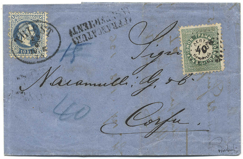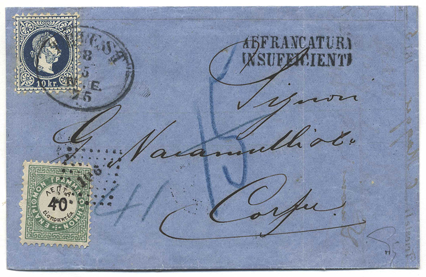 Katalognummer: 457 Österreich, 1875, TRIEST - CORFU, wirkungsvoller Faltbrief mit 10Kr - Einzelfrankatur der Nr 38 Ia, vorderseitig mit Nebenstempel "AFFRANCATURA ISUFFICIENTE", Blaustempeltaxe "15" + "40" und griechischer 40 Lepta Nachprt... mehr lesen