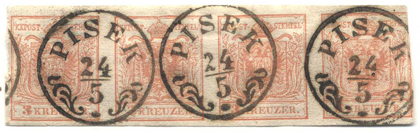 Österreich, 1850, Böhmen, PISEK, drei ideal sitzende Einkreisstempel auf waagrechtem Viererstreifen 3 M III, meist breitrandig, lediglich rechts getroffen, attraktive Einheit!