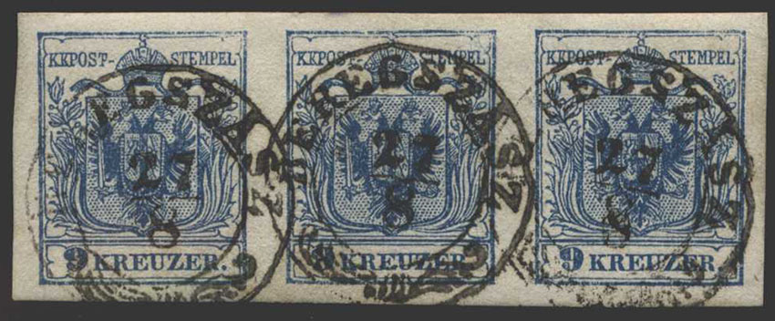 Österreich, 1850, Ungarische Gebiete Ukraine, BEREGSZASZ, 8p. drei sitzende Doppelkreisstempel auf taufrischen Dreierstreifen 5 M IIIb, breitrandiges frisches PRACHTSTÜCK, Befund Dr.Ferchenbauer