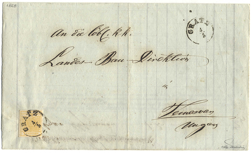 Österreich, 1850, Steiermark, GRATZ, zarter Abschlag auf 1 M III, gelb, als Einzelfrankatur auf wirkungsvoller - ungewöhnlich großformatiger Drucksache nach TEMESVAR 1858, taufrisches P! Befund Dr.Ferchenbauer