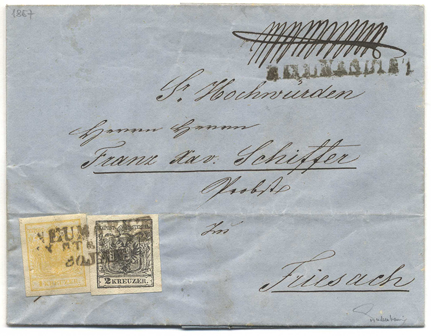 Österreich, 1850, Wien/Vororte, WIEN, 450p, kräftiger Abschlag des stummen Nachentwertungsstempel auf 6 Kreuzer - Brief aus MÜRZZUSCHLAG 1850, die 4 H I voll- bis breitrandig, der Brief sauber beschriftet, interessantes ... mehr lesen