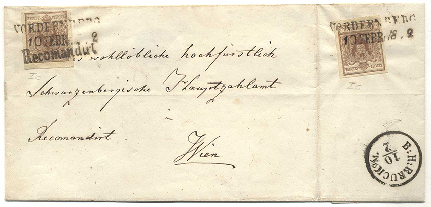 Österreich, 1850, Steiermark, VORDERNBERG, taufrischer REKOBRIEF nach WIEN, vorder- und rückseitig frankiert mit jeweils frischen Werten 4 H I, die Marke vorderseitig entwertet mit Langstempel von 1852 + klarem "Recomand... mehr lesen