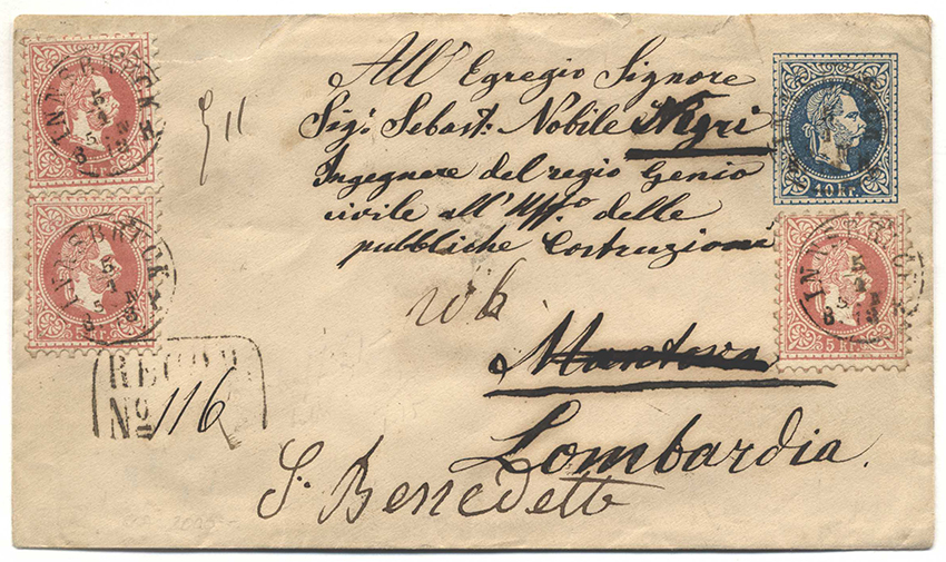 Österreich, 1870, Böhmen, PRAG - MADERNO (Gardasee), sauber beschrifteter 5Kr - Ganzsachenumschlag der Ausgabe 1867 mit 2 x Nr 38 I als Zusatzfrankatur für Porto inkl. vorderseitig geklebtes Reko, rückseitig Ankunftsstem... mehr lesen