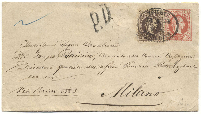 Österreich, 1873, Küstenland, TRIEST - MILANO, 5kr - Ganzsachenumschlag mit seltener 25Kr - Zusatzfrankatur Nr 40 I, das dreiseitig geöffnete Kuvert ist sauber beschriftet, vorderseitig mit Vermerk der 2.Gewichtsstufe, r... mehr lesen