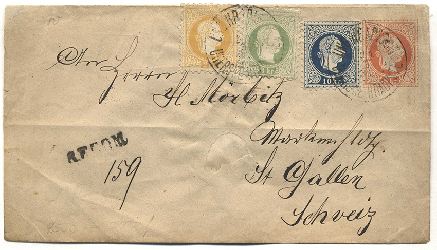 Österreich, 1881, UNG.HRADISCH - ST.GALLEN (CH), besonders wirkungsvoller Rekobrief bzw. 4 FARBEN - FRANKATUR auf 5Kr - Ganzsachenumschlag mit Nr 35 II + 36 II + 38 II, die Werte in farbfrischer Erhaltung, lediglich die ... mehr lesen
