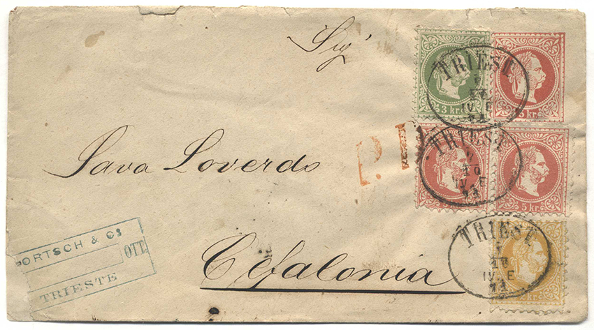 Österreich, 1871, TRIEST - CEFALNONIA (GR), sauber beschrifteter 5Kr - Ganzsachenumschlag mit wirkungsvoller 3 - Farben - Zusatzfrankatur der Nr 36 I +waagrechtem Paar 37 I + 35 I, die Werte teilweise mit Zähnungsfehlern... mehr lesen