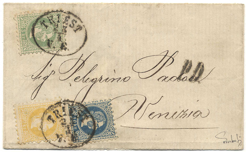 Österreich, 1867, Küstenland, TRIEST, zwei klare Ovalstempel auf wirkungsvoller 3 - Farben - Frankatur mit 36 I + 35 I + 38 I, die Werte vorderseitig auf unkomplettem (Ober- und Unterklappe fehlen), sauber beschriftetem ... mehr lesen