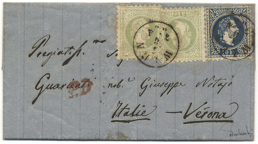 Österreich, 1864/67, Wien/Vororte, WIEN, besonders wirkungsvoller Faltbrief nach NEAPEL mit extrem seltener Stückelung einer 3 - Farben - Ausgabenmischfrankatur, der vorderseitig sauber beschriftete und portogerechte Bel... mehr lesen