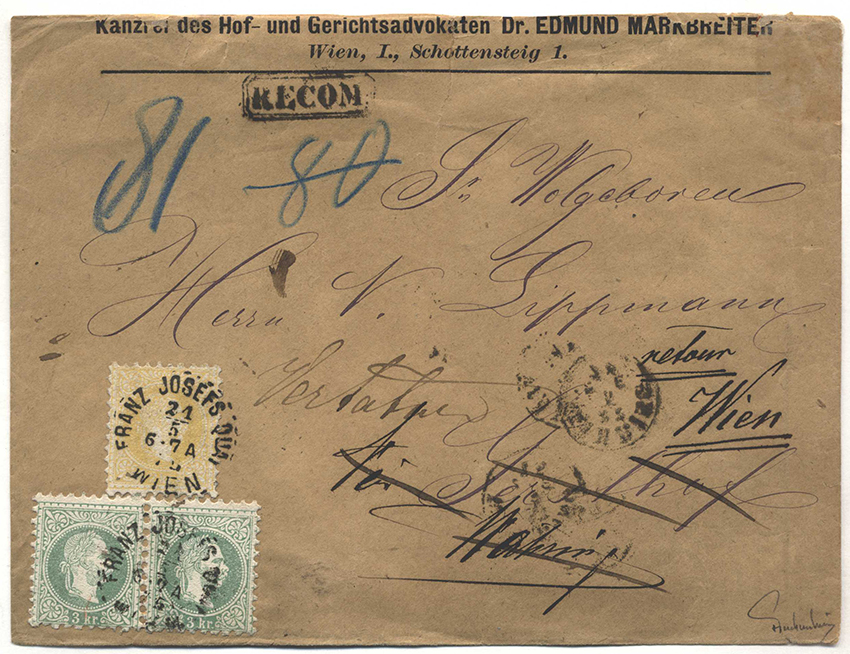 Österreich, 1875, WIEN, kompletter ORTSREKOBRIEF aus Wien mit seltener Stückelung des 3Kr - Portos bzw. 5Kr - Rekogebühr, die vorderseitig frankierte 8Kr - Frankatur mit jeweils vollzähnigen Werten 35 I + 3& I (2), der w... mehr lesen