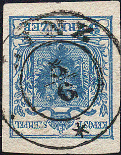 Austria, 1850, Upper Austria, LINZ, 40 p, inscription complete cancellation, 5 H II, 9 kr, blue, Hand-made paper, canceled, rare, attractive and impressive item!