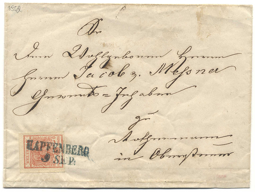 Österreich, 1850, Steiermark, KAPFENBERG/B. H., 50 p, sitzender, kräftiger BLAUSTEMPEL auf rundum breitrandiger 3 H III, als Einzelfrankatur auf frischem PRACHTBRIEF nach LEOBEN 1853, Attest Mag. Babor