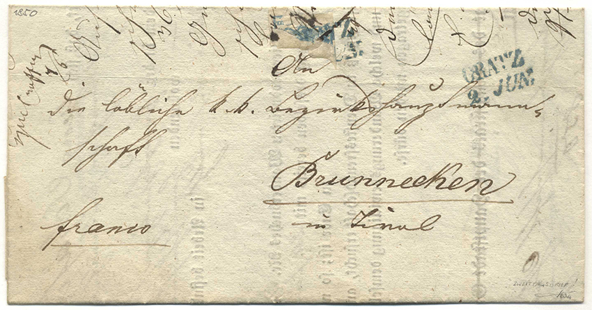 Österreich, 1850, Steiermark, GRATZ, postgeschichtlicher hochinteressanter Faltbrief der BH GRATZ an die BH BRUNECKEN in Tirol vom 2.JUNI 1850, der an und für sich PORTOFREIE Beleg wurde wohl auf Grund der am 1.Juni 1850... read more