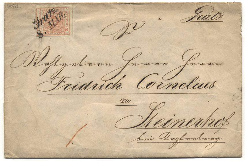 Österreich, 1850, Steiermark, GRATZ, interessanter Faltbrief nach STEINERHOF bei Kapfenberg, portorichtig frankiert mit 3 H I, zusätzlich mit Rötel "1" markiert, vermutlich als Botenlohn (R!), Prachtstück!