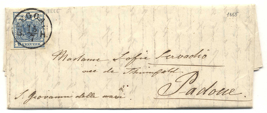 Österreich, 1850, Steiermark, PEGGAU B.H., 12p, ideal sitzender, klarer Abschlag auf 5 M III, als EF auf taufrischem erlesenem Faltbrief nach PADOVA aus bekannter Thinnfeld - Korrespondenz 1855, Luxuserhaltung!
