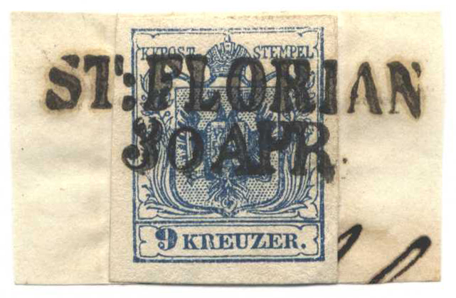 Österreich, 1850, Steiermark, ST.FLORIAN, 25p, perfekt sitzender, besonders klarer Abschlag auf KABINETTBRIEFSTÜCK mit 5 M III, dunkelblau