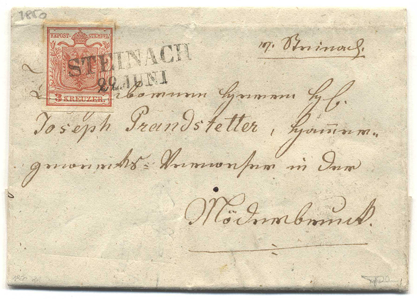 Österreich, 1850, Steiermark, STEINACH, kompletter klarer Abschlag vom 22.JUNI 1850 auf 3 H I a1, farbfrische Marke mit Papierfalte, als EF frischem Faltbrief nach MÖDERBRUGG, die Marke gering fleckig sonst der Faltbrief... read more
