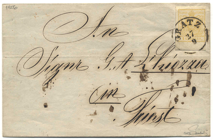 Austria, 1850, Styria, GRATZ, circular postmark on a 5mm - LOWER EDGE PIECE of a 1 M III, cadmium yellow, sent as a letter sheet to TRIEST in 1856, fresh MAGNIFICENT PIECE, expertized by Dr. Ferchenbauer.