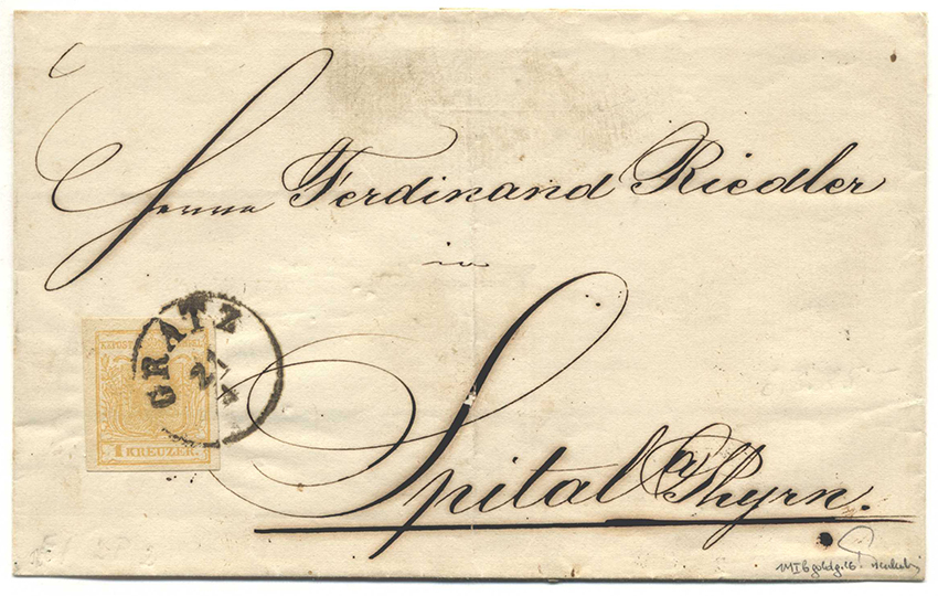 Österreich, 1850, Steiermark, GRATZ, klarer sitzender Abschlag des Einkreisstempel auf farbintensiver 1 M I, GOLDGELB, auf Drucksache nach SPITAL am Phyrn, rückseitig Durchgangsstempel LIEZEN und Ankunftsstempel Spital, ... read more