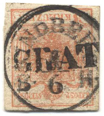 Austria, 1850, Styria, GRATZ, 400 p, clear strike of the rare single stamp with double cancellation featuring KINDBERG B.H. on 3 H III, full margin P! rare!
