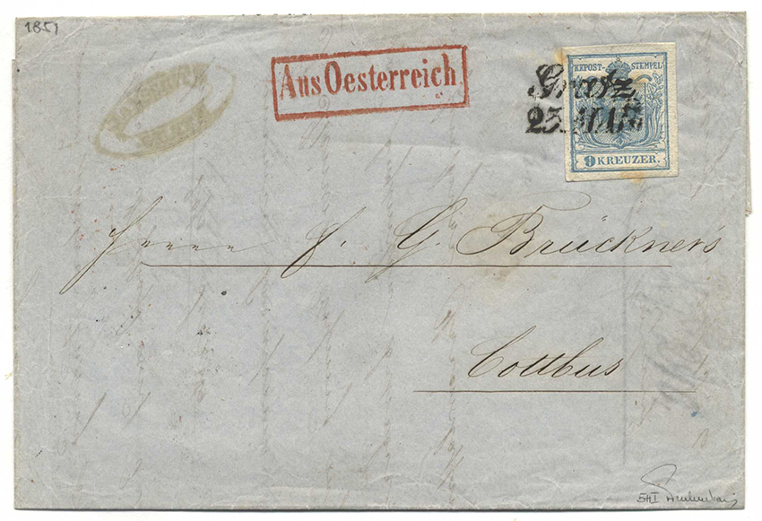 Österreich, 1850, Steiermark, GRATZ, Schreibschriftstempel auf vollrandiger farbfrischer 5 H II, auf die Einzelfrankatur übergehend der rote Kastenstempel "Aus Oesterreich", zusammen auf frischem Faltbrief nach COTTBUS, ... read more