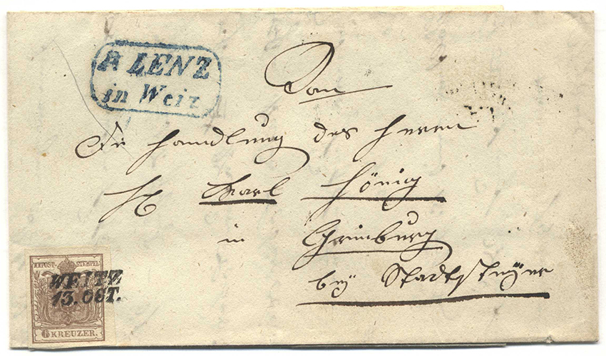 Austria, 1850, Styria, WEITZ, particularly clear and ideally placed long stamp on 4 H III in exceptionally striking fine print, rated EF on a fresh folded letter to GRÜNBURG near Steyr, exquisite PIECE OF ART!