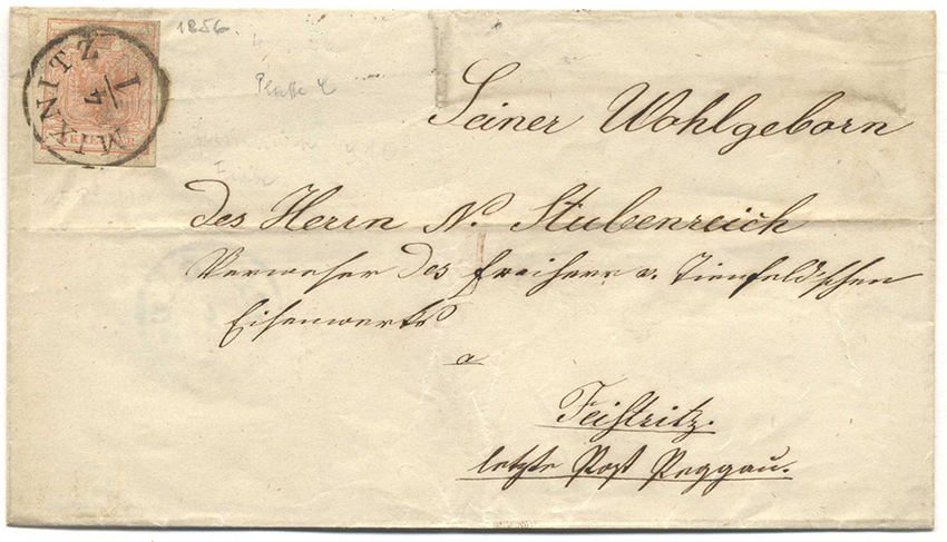 Austria, 1850, Styria, MIXNITZ, clear complete impression on 3 M III, as EF on folded letter cover to FEISTRITZ 1856, excellent condition!