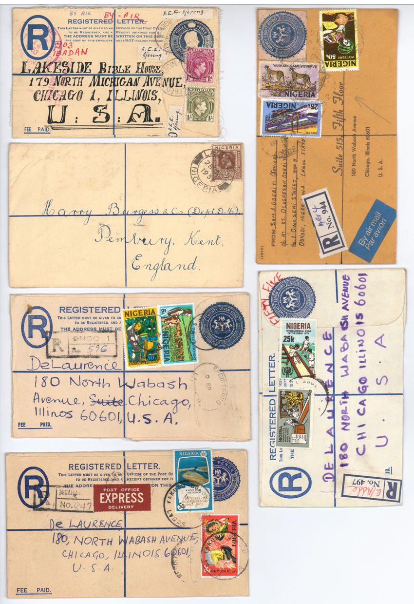Nigeria, 1932/80, Lot mit ca. 40 REKO - AIRMAIL - Belegen, alle in die USA, untersch. Aufgabeorte, Rekozettel und Provisorien, Ganzsachenausschnitte als Frankaturen, etc., meist sehr gute frische Erhaltung, Spezialistenp... read more