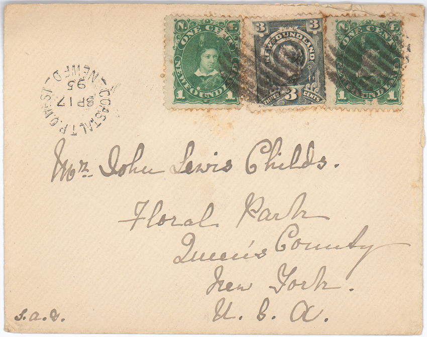 NEW FOUNDLAND, 1895, cover franked 1887 1c green (2) + 1890/94 3c gray-violet postmarked circle grill cancel alongside"COASTAL T.P.O WEST 17.9.95" to New York, small faults good postmark