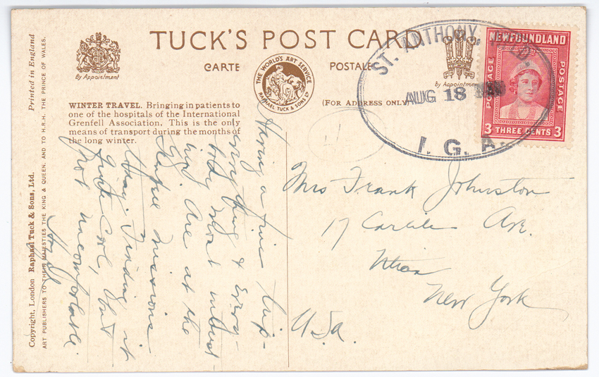 NEW FOUNDLAND, 1938, Ppc franked 3c red 1938-44 definitives postmarked large oval "ST. ANTHONY 18.8.1938" to USA