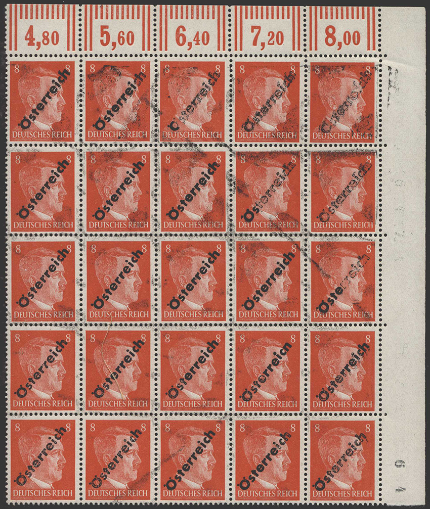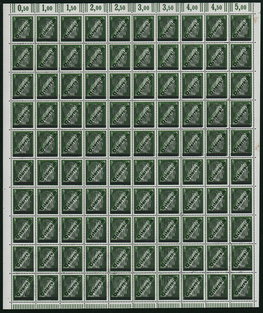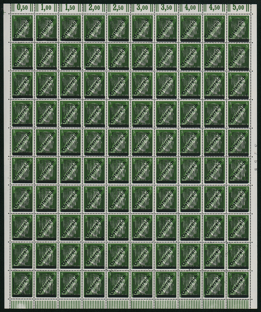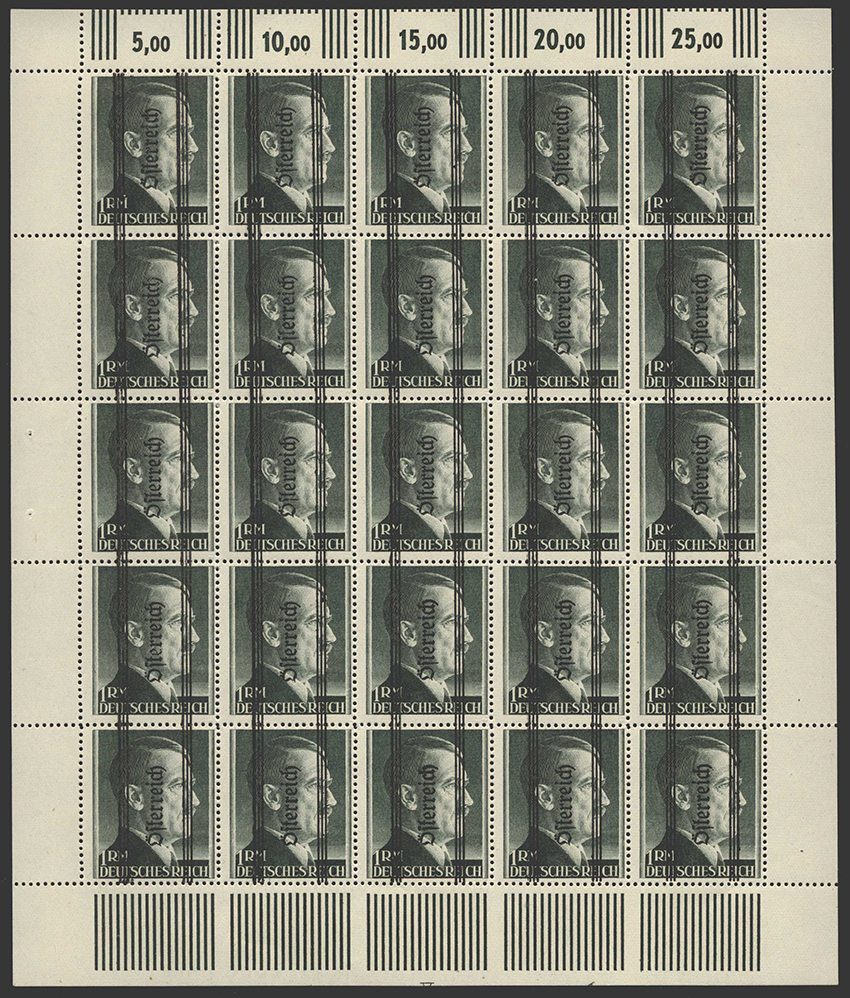 Katalognummer: 1085 Österreich, 1945, 693 II, 1 RM, Grazer Aushilfsausgabe, magerer Aufdruck, kompletter Bogen, postfrisch **, signiert