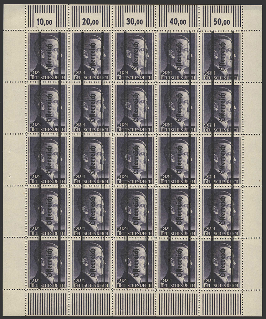 Katalognummer: 1086 Österreich, 1945, 694 I, 2 RM, Grazer Aushilfsausgabe, fetter Aufdruck, LZ 12 1/2, kompletter Bogen, Perforation tw. getrennt, postfrisch **