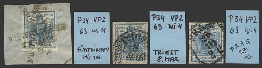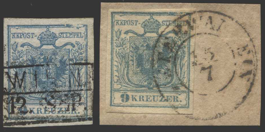 Catalogue number: 50 Österreich, 1850, 5 H I, Magistris P 21, zwei Werte in untersch. Stadien, lose gestempelt WIEN + Briefstück HERMANNSTADT