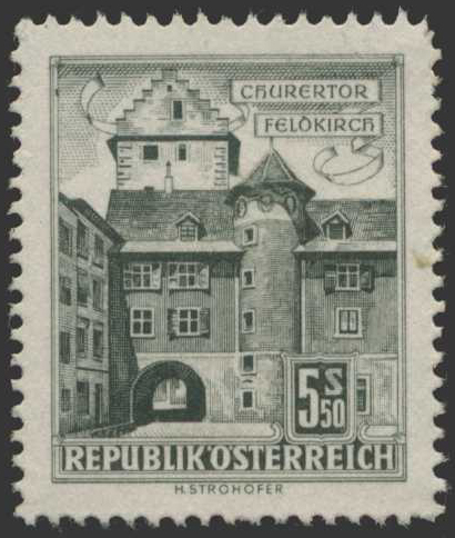Numero di catalogo: 1173 Österreich, 1957/70, 1110 P I, 5,50 S Groschen Churertor / Feldkirch, Bauwerke und Baudenkmäler, Probedruck in dunkelgraugrün, ohne Gummi, echt und einwandfrei