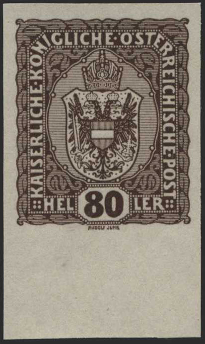 Numero di catalogo: 440 Österreich, 1916, 197 PU, 80 Heller, Freimarke Wappen, ungezähnte Farbprobe in Dunkelbraun vom Unterrand, Prachtstück!, Attest Soecknick