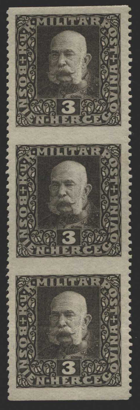Numero di catalogo: 698 Bosnien-Herzegowina, 1916, 99 wU, 3 Heller, Kaiser Franz Joseph, senkrechter 3er Streifen, waagrecht ungezähnt, postfrisch **, echt und einwandfrei, Prachterhaltung!, Attest Soecknick