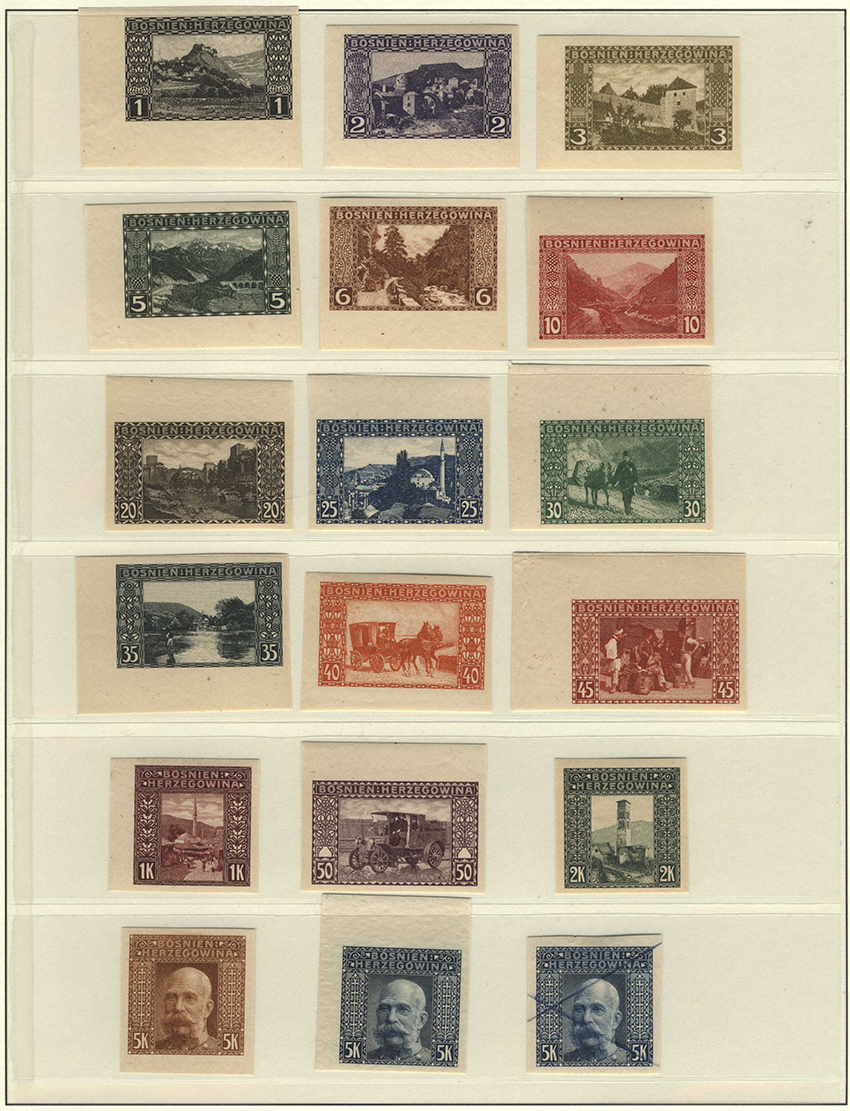 Numero di catalogo: 684 Bosnien-Herzegowina, 1906, 29-44 U, ungezähnt, Landschaftsbilder, postfrisch **, echt und einwandfrei, Prachterhaltung!, zusätzlich 2 Probedrucke (*) des 5 K Wertes, KW 500 € ++
