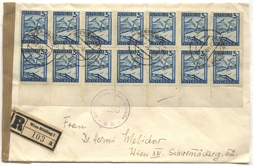 Numero di catalogo: 946 Österreich, 1946, WIEN MÖDLING - WIEN, wirkungsvoller Rekobrief mit 14er - Block der ANK Nr 738, portogerecht frankiert und russisch zensiert, einwandfreie Bedarfserhaltung!