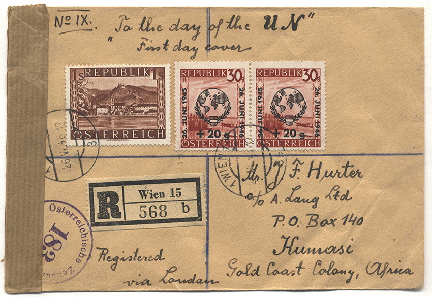Numero di catalogo: 941 Österreich, 1946, WIEN - KUMASI (Ghana), portogerechter Flugpostreko mit Ausgabenmischfrankatur der Nr 771 + 775 (2), Pracht!
