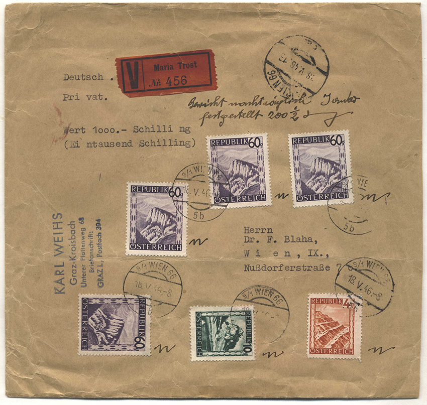 Numero di catalogo: 950 Österreich, 1946, WIEN, portogerechter Wertbrief über 1000 Schilling mit 4 x Nr 762 + 745 + 739, deutscher Wertbriefzettel "Maria Trost", rückseitig versiegelt, sehr gute Erhaltung, UNIKAT, Attest Dr.Glavanovitz