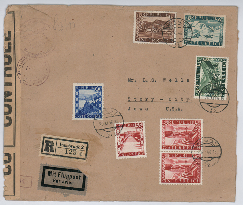 Numero di catalogo: 943 Österreich, 1946, WIEN - STORY CITY (Iowa), großformatiger FLUGPOST - Reko, frankiert mit allen vier Schilling - Werten der bunten Landschaft, unterfrankiert, mit französischer Zensur, wirkungsvolle Bedarfserhaltung!