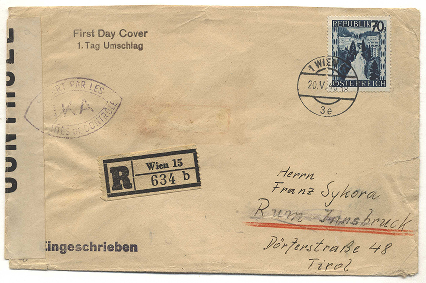 Numero di catalogo: 940 Österreich, 1946, WIEN - INNSBRUCK, seltener Ersttagsbrief der 70 Gr - Marke Nr 764 vom 20.V.1946, als Einzelfrankatur auf portogerechtem Reko der 3.Gewichtsstufe, mit IKA - Zensur, mit Ankunftsstempel, als unzustellbar ... read more