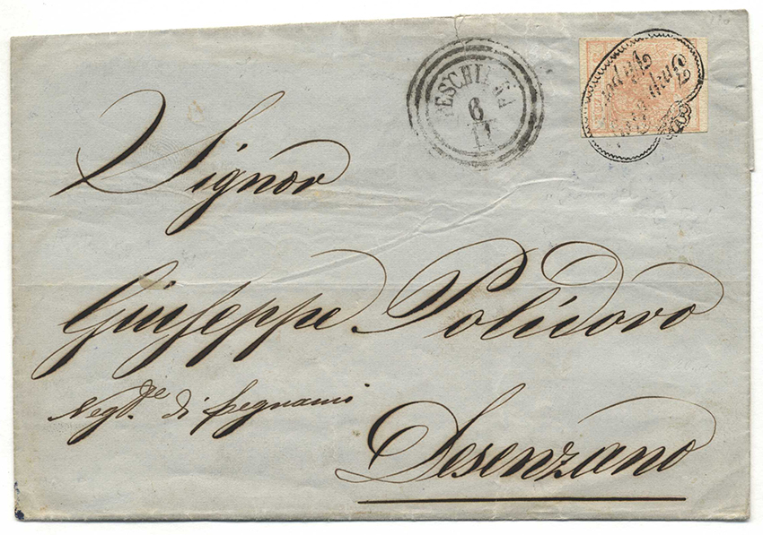 Österreich, 1850, Südtirol, IMP. REG./VAPORI, 64 p, zarter, kompletter Stempelabschlag 3 M III, auf Briefhülle mit Durchgangsstempel PESCHIERA nach DESENZANO, attraktives rel. P!