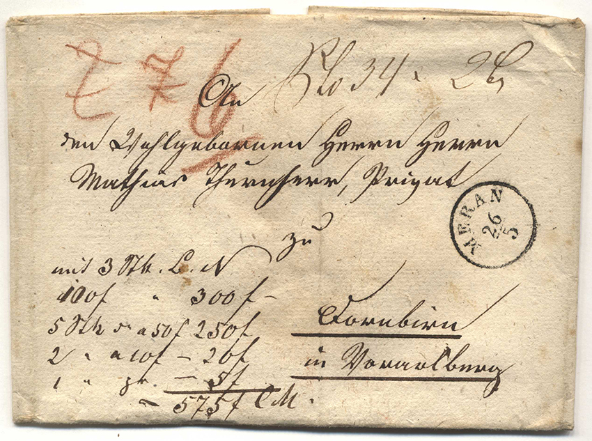 Österreich, 1850 ca., Südtirol, MERAN, klarer Einkreisstempel auf interessantem WERTBRIEF nach DORNBIRN, vorderseitig mit zwei gestrichenen Röteltaxe "2" u. "7", endgültig mit "6" taxiert, Pracht!