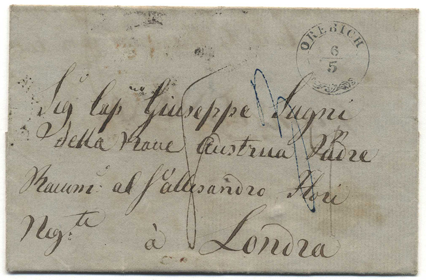 Österreich, 1855, Dalmatien, OREBICH, klarer Abschlag auf frischem Portobrief n. LONDON, vorderseitig mit div. Taxvermerken, via CURZOLA u. TRIEST, PRACHTERHALTUNG!