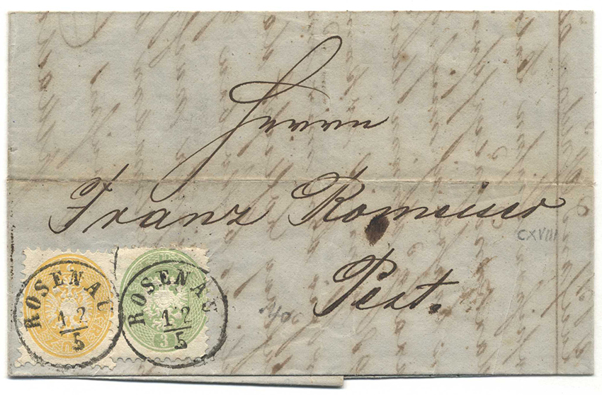 Österreich, 1864, Ungarische Gebiete Slowakei, ROSENAU, zwei klare aufrecht sitzende Einkreisstempel auf gelb - grün Frankatur eines kompletten Faltbriefes nach PEST, die Werte Nr 30 + 31 jeweils vollzähnig und frisch, d... mehr lesen