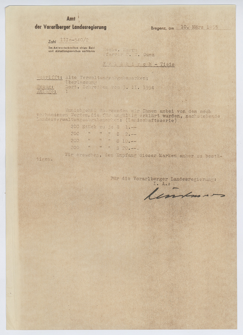 Österreich, 1950 ca., VORARLBERG - LANDESVERWALTUNGSABGABE - MARKEN zu 1S, 2S, 10S und 20S, jeweils KOMPLETTBOGEN in tadelloser frischer Erhaltung mit Originalgummierung! SELTEN!